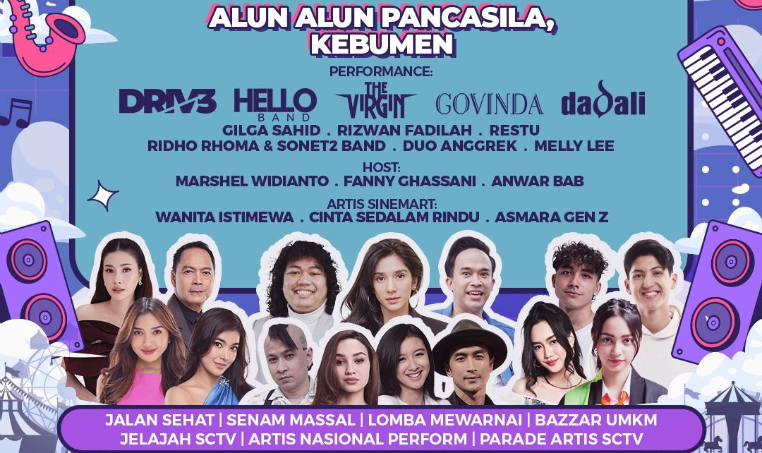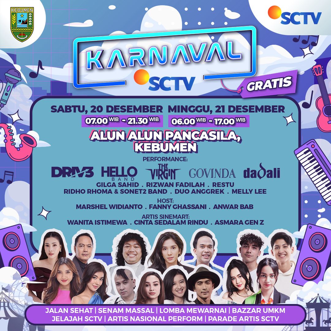 SCTV akan menyiarkan Karnaval SCTV Kebumen secara LIVE pada Sabtu, 20 Desember 2025 pukul 14.00 WIB. Panggung pembuka akan dimeriahkan oleh Ridho Rhoma & Sonet2 Band, Hello Band, serta Restu Vanhouten. Deretan bintang sinetron “Wanita Istimewa” seperti Adipura, Demmy Febriana, Raya Kohandi, dan Yuriska Patricia turut hadir menyapa pemirsa.